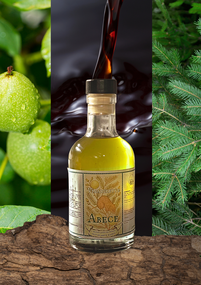 Abece è una vinaigrette fresca e balsamica, costruita su due ingredienti che parlano la lingua del bosco:
