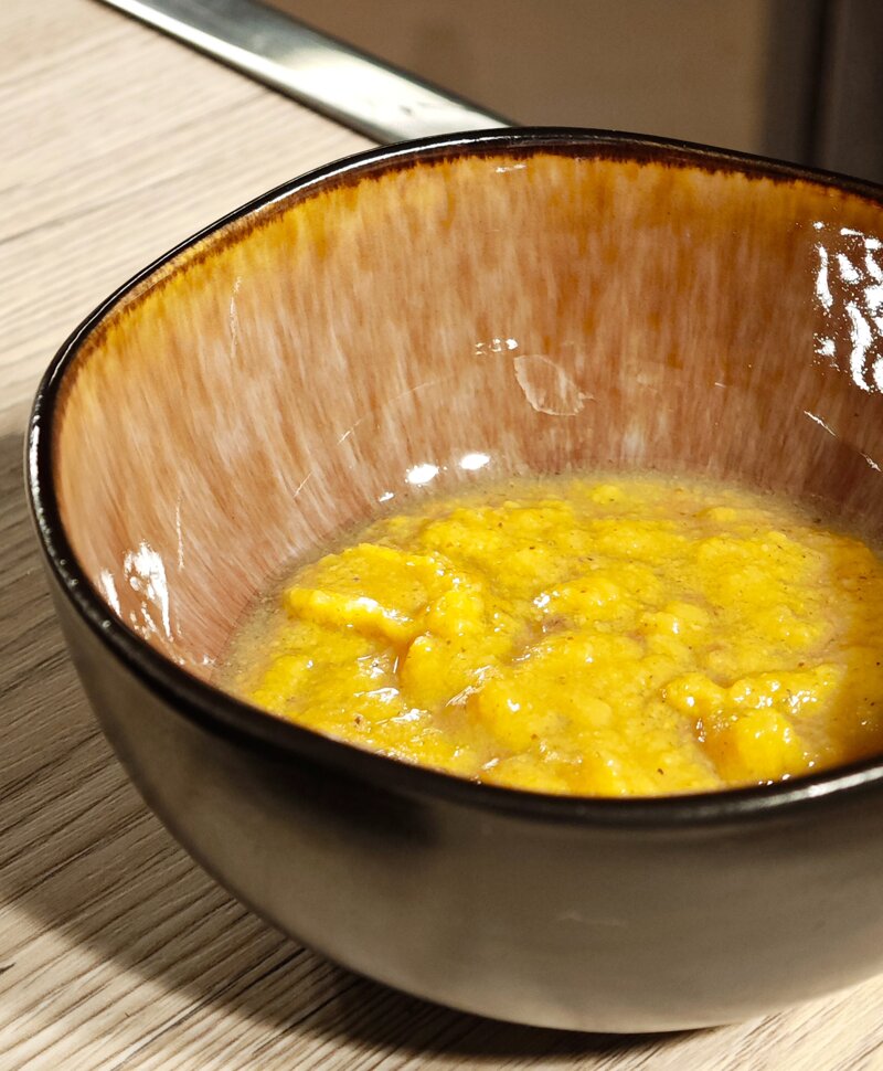 La consistenza è cremosa, punteggiata dai semi idratati che scoppiano sotto i denti, mentre la dolcezza dei cachi viene bilanciata da un filo di limone e da una nota speziata calda e persistente.